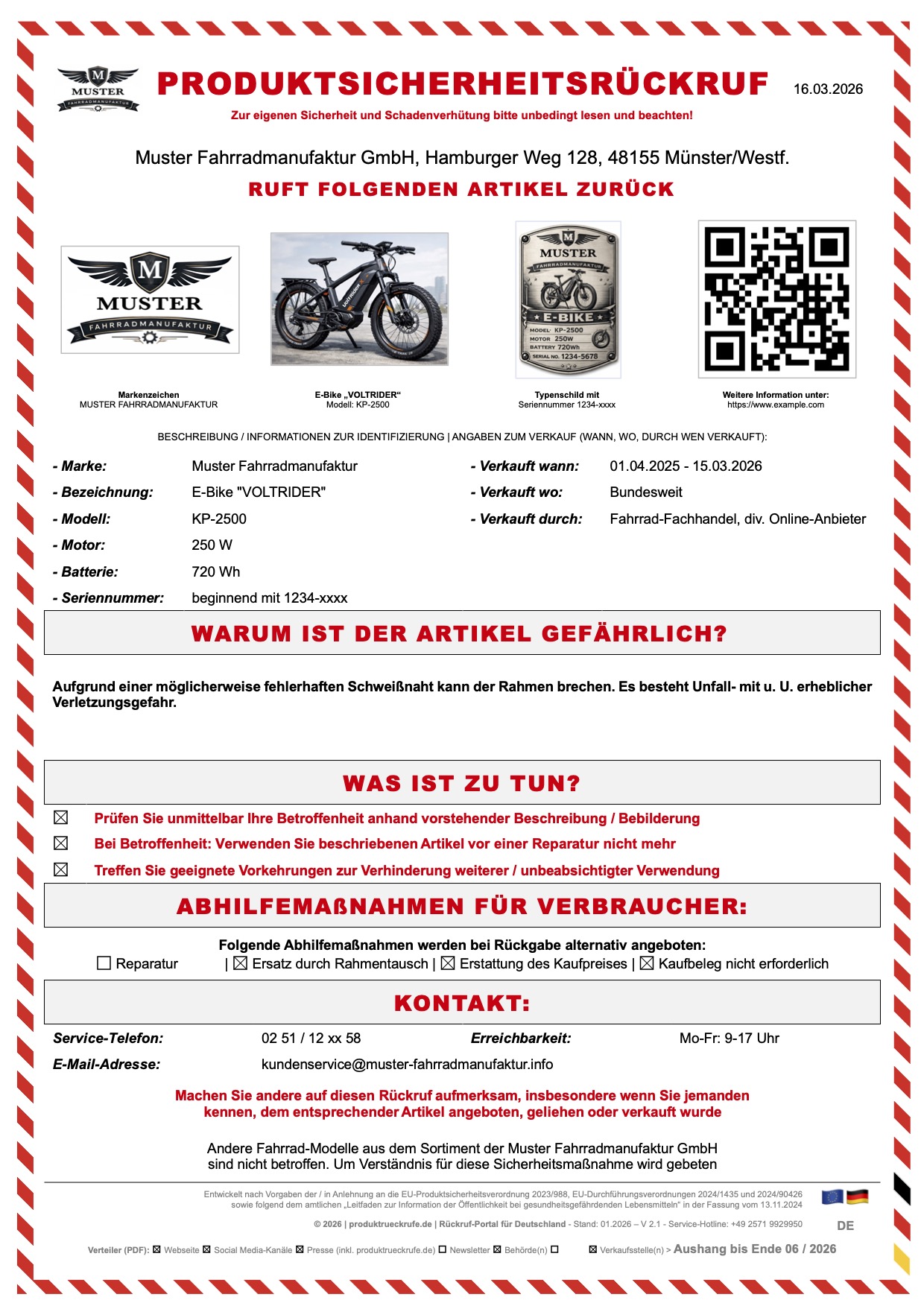 Mit einem auf die Fertigung, Bereitstellung und Distribution von regelkonformen „Rückrufanzeigen“ spezialisierten "Start-up" werden rückrufverantwortliche Unternehmen ohne rückruferfahrene PR-Agentur bei der gesetzlich geforderten Verbraucherinformation unterstützt. Grundlagen für diese diffizile Arbeit sind neben dem internationalen Standard ("ISO 10393:2013") die verbindliche "Verordnung über die allgemeine Produktsicherheit (GPSR)" der EU, der "Leitfaden zur Information der Öffentlichkeit bei gesundheitsgefährdenden Lebensmitteln" der VSMK sowie ... Erfahrung.